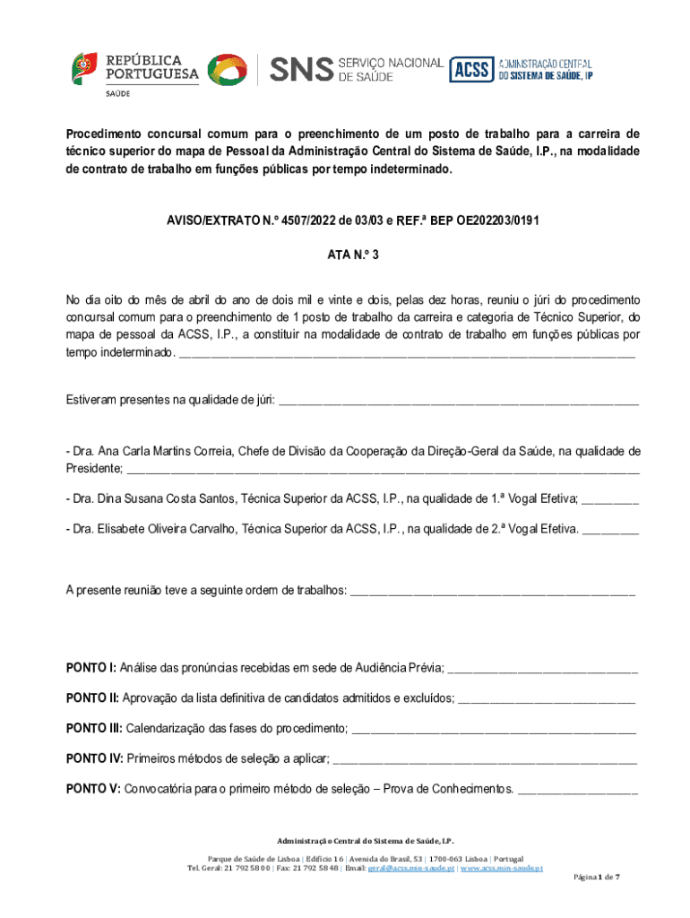 Procedimento concursal comum para o preenchimento de um posto de trabalho para a carreira de tcnico superior do mapa de Pessoal da Administrao Central do Sistema de Sade, I.P., na modalidade de contrato