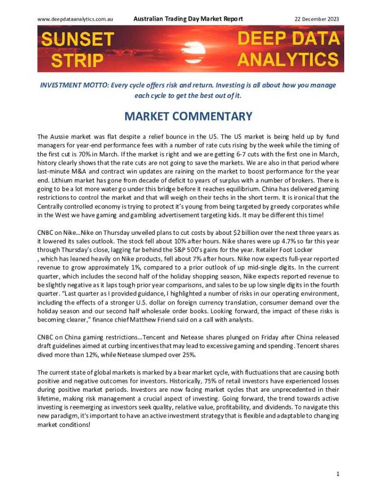 WWW.deepdataanalytics.com.Australian Trading Day Market Report22 December 2023INVESTMENT MOTTO: Every cycle offers risk and return. Investing is all about how you manage
