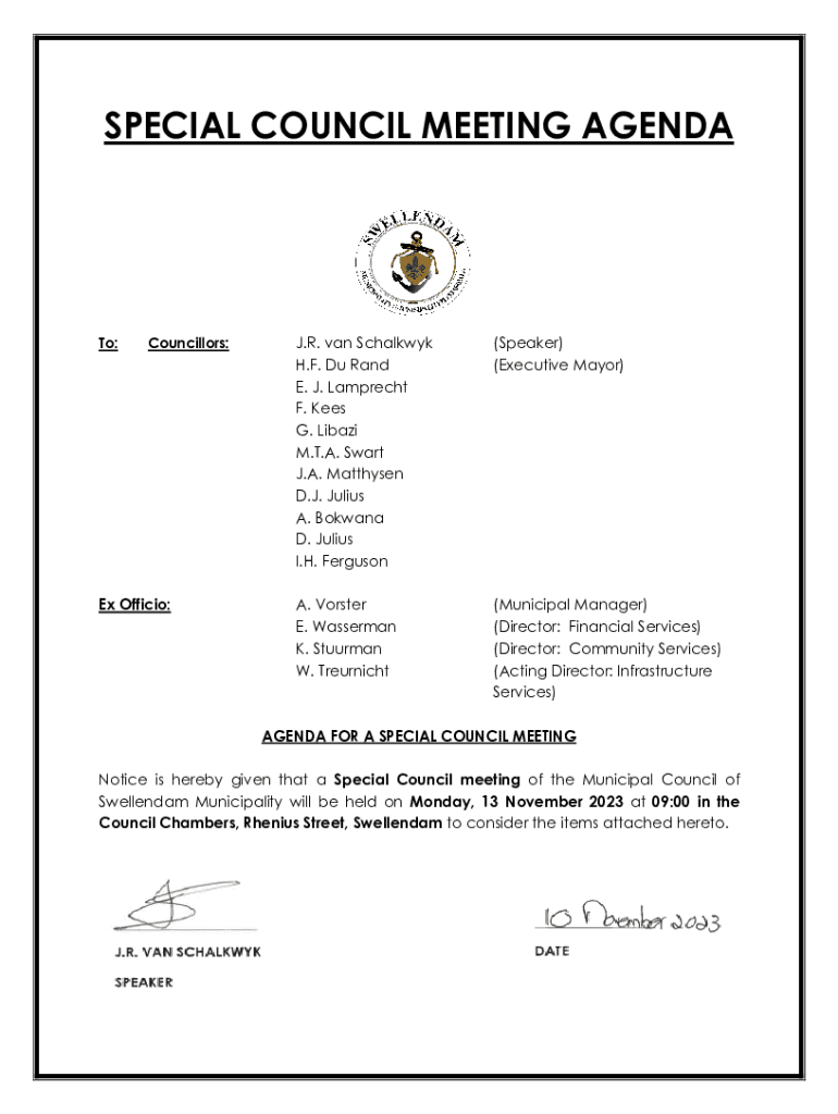 SPECIAL COUNCIL MEETING AGENDATo:Councillors:Ex Officio:J.R. van Schalkwyk H.F. Du Rand E. J. Lamprecht F. Kees G. Libazi M.T.A. Swart J.A. Matthysen D.J. Julius A. Bokwana D. Julius I.H. Ferguson(Speaker)