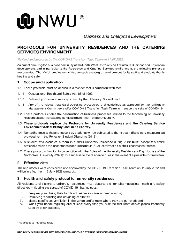 Business and Enterprise Development PROTOCOLS FOR UNIVERSITY RESIDENCES AND THE CATERING SERVICES ENVIRONMENT Revised and approved by the COVID-19 Transition Task Team on 11.07.2022. As part of ensuring