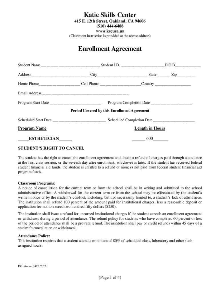 Katie Skills Center 415 E. 12th Street, Oakland, CA 94606 (510) 4446488 www.kscusa.us (Classroom Instruction is provided at the above address)Enrollment Agreement Student Name___ Student I.D. ___D.O.B___