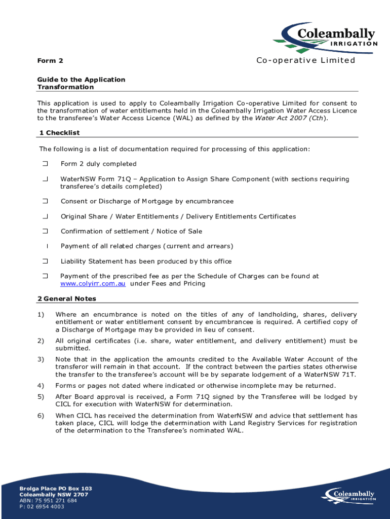 This application is used to apply to Coleambally Irrigation Cooperative Limited for consent to