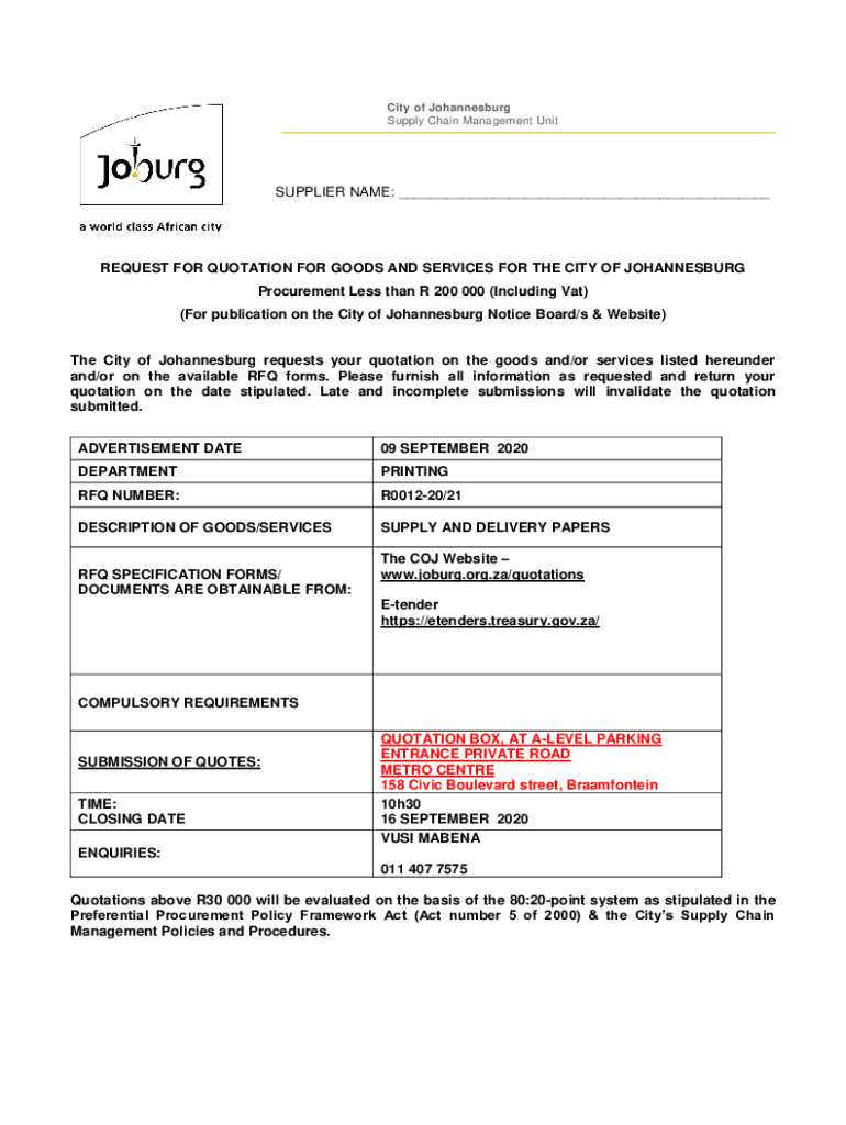 City of Johannesburg Supply Chain Management UnitSUPPLIER NAME: ___REQUEST FOR QUOTATION FOR GOODS AND SERVICES FOR THE CITY OF JOHANNESBURG Procurement Less than R 200 000 (Including Vat) (For publication