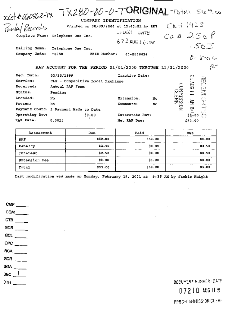 Mailing Name:Telephone One Inc. Company code:TX280FEID Number:1