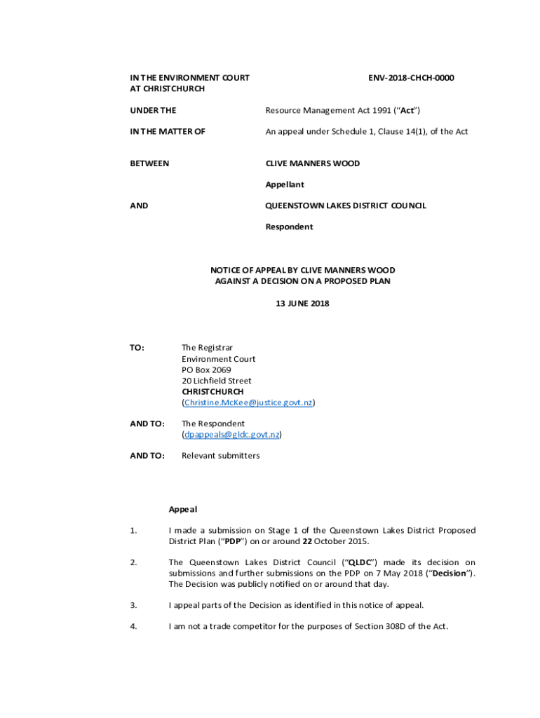 IN THE ENVIRONMENT COURT AT CHRISTCHURCHENV2018CHCH0000UNDER THEResource Management Act 1991 (Act)IN THE MATTER OFAn appeal under Schedule 1, Clause 14(1), of the ActBETWEENCLIVE MANNERS WOOD AppellantANDQUEENSTOWN