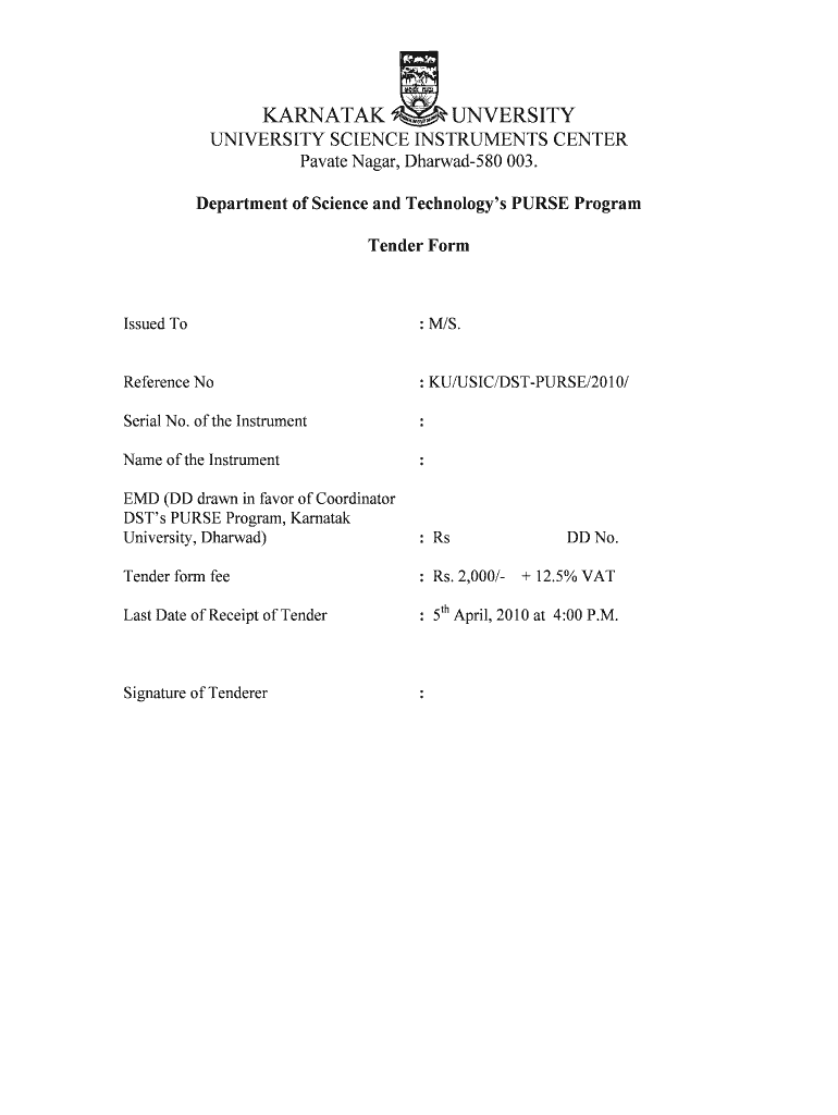 KARNATAKA UNIVERSITY SCIENCE INSTRUMENTS CENTER Palate Nagar, Dharwad-580 003. Department of Science and Technology s PURSE Program Tender Form Issued To : M/S. Reference No : KU/USIC/DST-PURSE/2010/