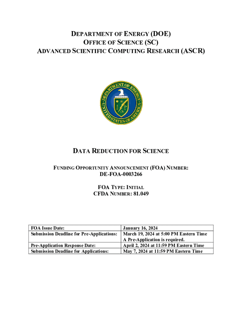 DEPARTMENT OF ENERGY (DOE) OFFICE OF SCIENCE (SC) ADVANCED SCIENTIFIC COMPUTING RESEARCH (ASCR) .DATA REDUCTION FOR SCIENCE FUNDING OPPORTUNITY ANNOUNCEMENT (FOA) NUMBER: DEFOA0003266 FOA TYPE: INITIAL