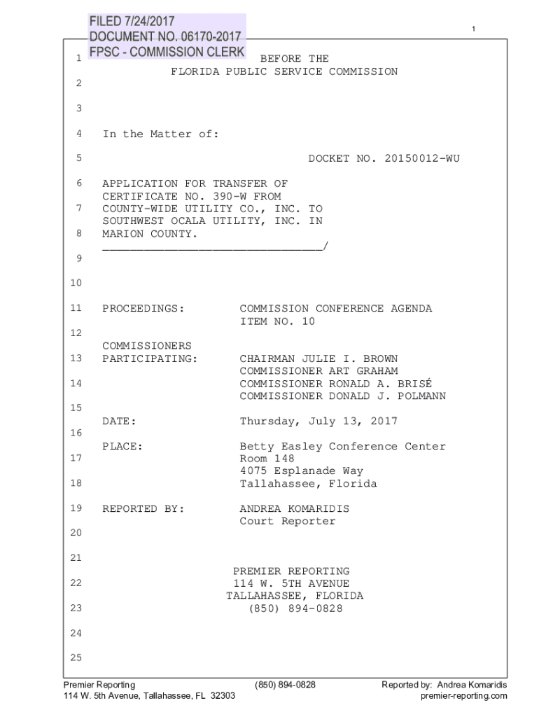 11BEFORE THE FLORIDA PUBLIC SERVICE COMMISSION2 3 4In the Matter of:5 6 7 8DOCKET NO. 20150012WU APPLICATION FOR TRANSFER OF CERTIFICATE NO. 390W FROM COUNTYWIDE UTILITY CO., INC. TO SOUTHWEST OCALA