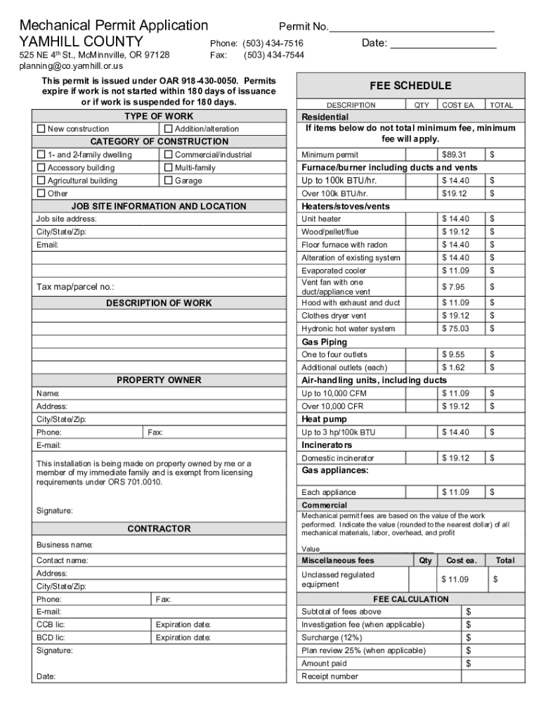 Mechanical Permit Application YAMHILL COUNTY Phone: 4th St.,525 NE McMinnville, OR 97128 planning@co.yamhill.or.usFax:Permit No.___This permit is issued under OAR 9184300050. Permits expire if work