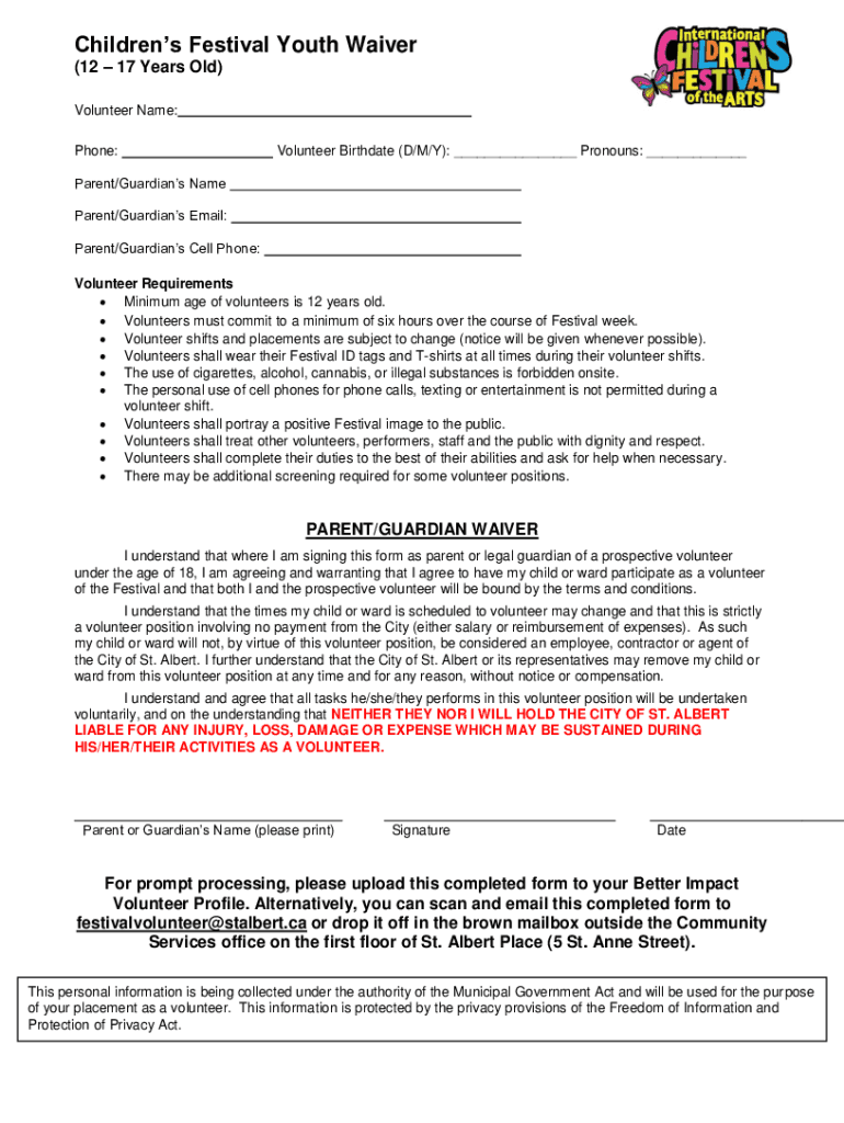 Children's Festival Youth Waiver (12 17 Years Old) Volunteer Name: Phone:Volunteer Birthdate (D/M/Y): ___ Pronouns: ___Parent/Guardians Name Parent/Guardians Email: Parent/Guardians Cell Phone: Volunteer
