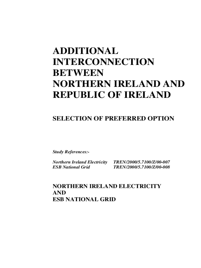 ADDITIONAL INTERCONNECTION BETWEEN NORTHERN IRELAND AND REPUBLIC OF IRELAND SELECTION OF PREFERRED OPTIONStudy References:Northern Ireland Electricity ESB National GridTREN/2000/5.7100/Z/00007 TREN/2000/5.7100/Z/00008NORTHERN