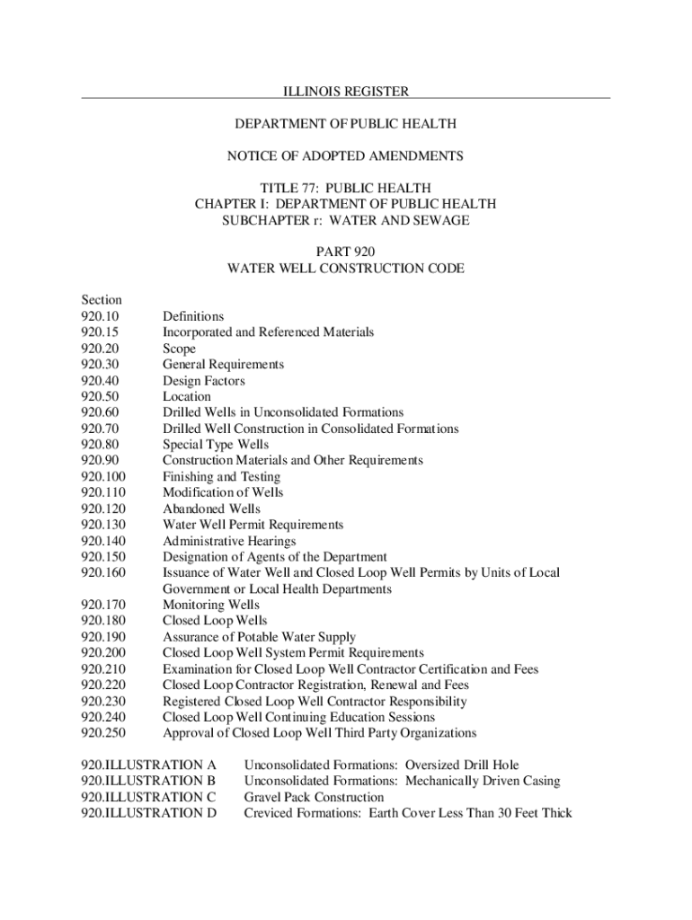 ILLINOIS REGISTER DEPARTMENT OF PUBLIC HEALTH NOTICE OF ADOPTED AMENDMENTS TITLE 77: PUBLIC HEALTH CHAPTER I: DEPARTMENT OF PUBLIC HEALTH SUBCHAPTER r: WATER AND SEWAGE PART 920 WATER WELL CONSTRUCTION
