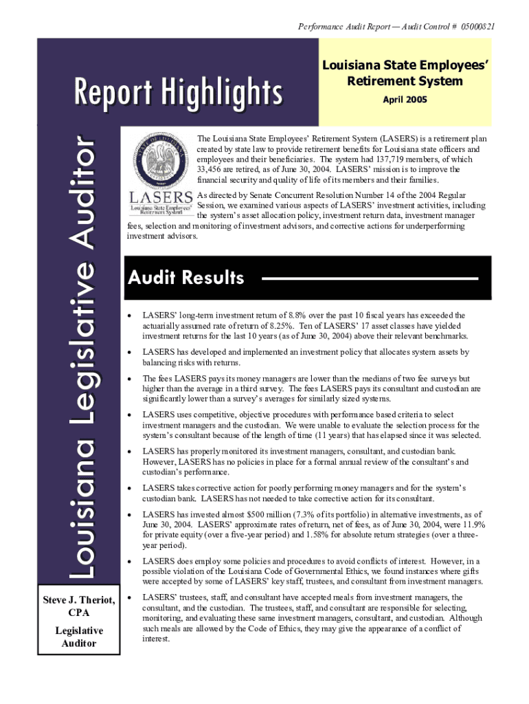 Performance Audit Report Audit Control # 05000821Louisiana Legislative AuditorReport HighlightsSteve J. Theriot, CPA Legislative AuditorLouisiana State Employees Retirement System April 2005The Louisiana