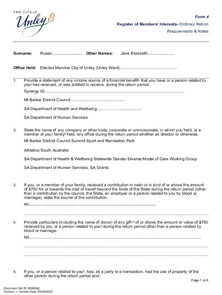 Requirements & NotesSurname:Russo........................... Other Names:Jane Elizabeth....................... Office Held: Elected Member City
