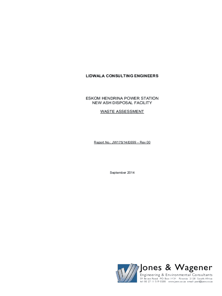 LIDWALA CONSULTING ENGINEERSESKOM HENDRINA POWER STATION NEW ASH DISPOSAL FACILITY WASTE ASSESSMENTReport No.: JW175/14/E699 Rev 00September 2014Jones & Wagener Engineering & Environmental Consultants