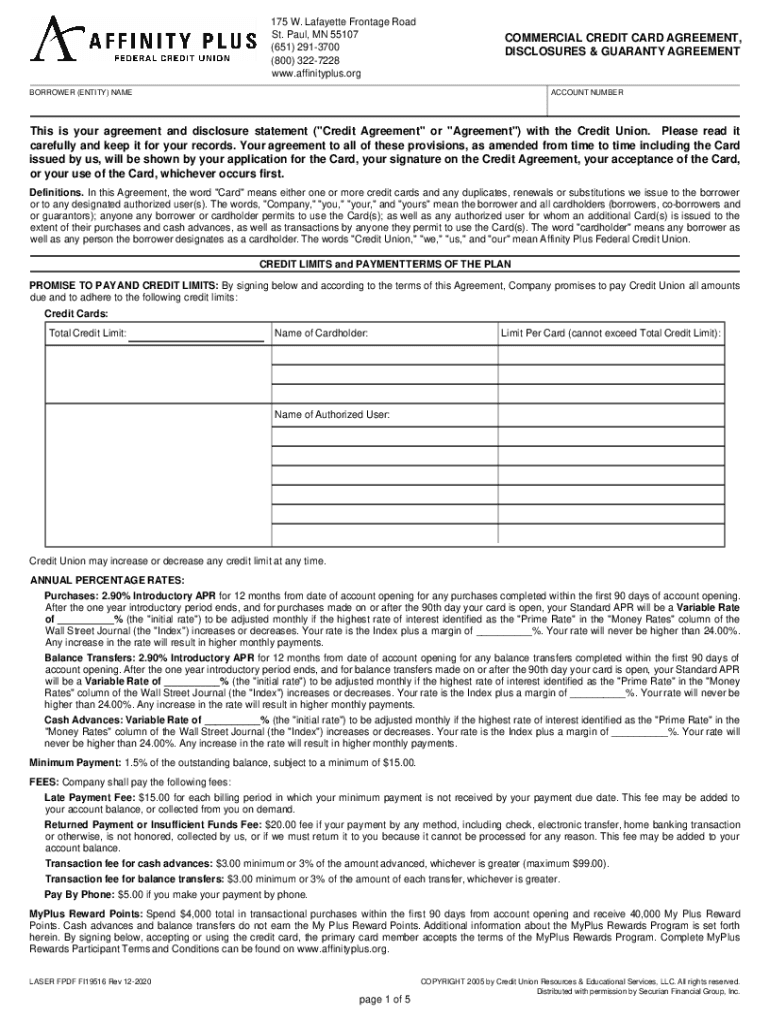 175 W. Lafayette Frontage Road St. Paul, MN 55107 (651) 2913700 (800) 3227228 www.affinityplus.orgCOMMERCIAL CREDIT CARD AGREEMENT, DISCLOSURES & GUARANTY AGREEMENTBORROWER (ENTITY) NAMEACCOUNT NUMBERThis