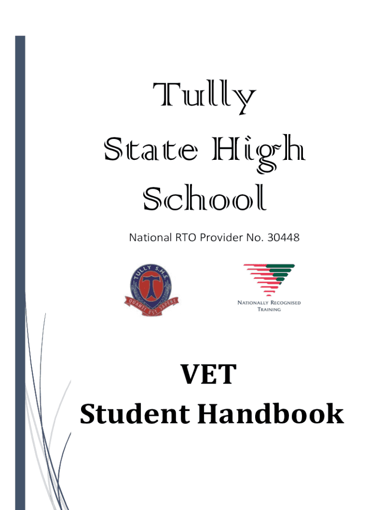 Tully State High School National RTO Provider No. 30448VET Student HandbookTully SHS VET Student HandbookIntroduction Welcome to Vocational Education and Training (VET) at Tully State High School.