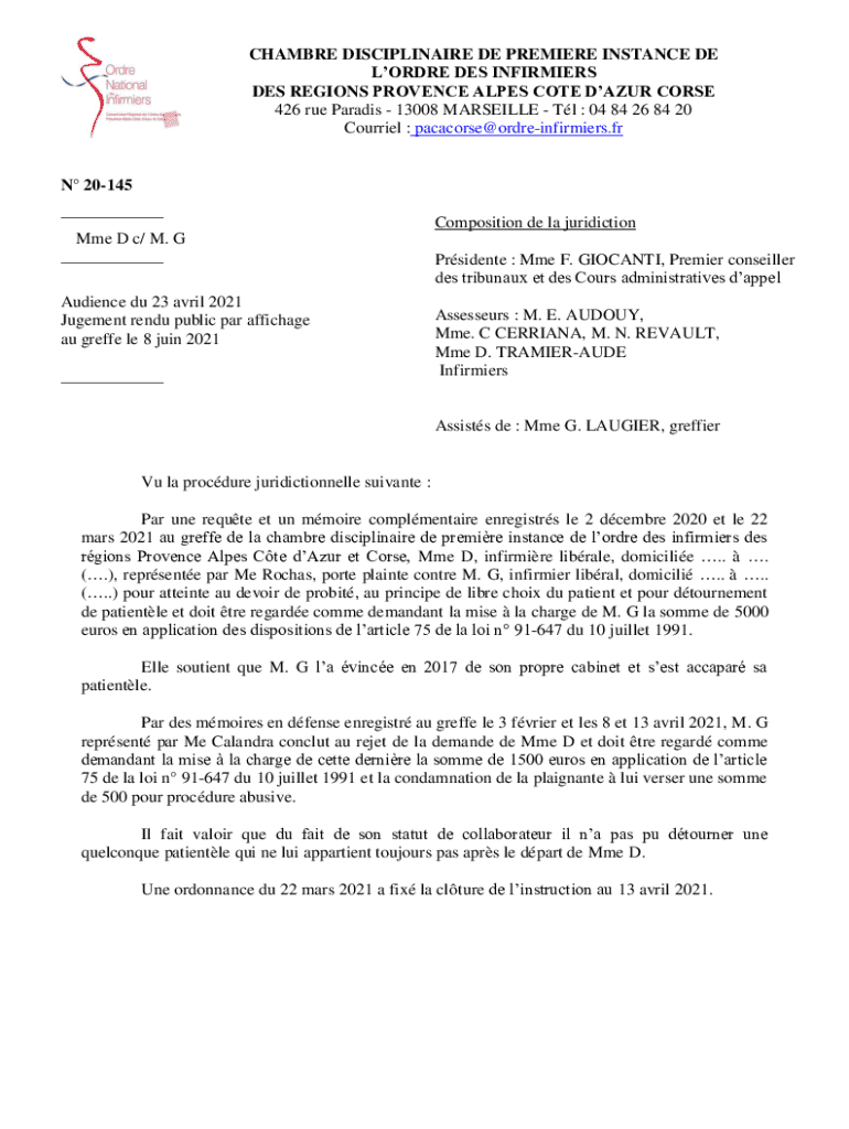 CHAMBRE DISCIPLINAIRE DE PREMIERE INSTANCE DE LORDRE DES INFIRMIERS DES REGIONS PROVENCE ALPES COTE DAZUR CORSE 426 rue Paradis 13008 MARSEILLE Tl : 04 84 26 84 20 Courriel : pacacorse@ordreinfirmiers.frN