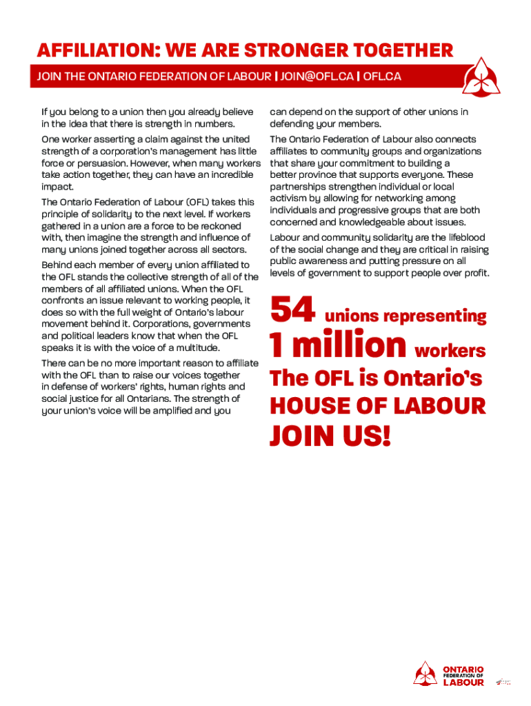 AFFILIATION: WE ARE STRONGER TOGETHER JOIN THE ONTARIO FEDERATION OF LABOUR | JOIN@OFL.CA | OFL.CA If you belong to a union then you already believe in the idea that there is strength in numbers.can