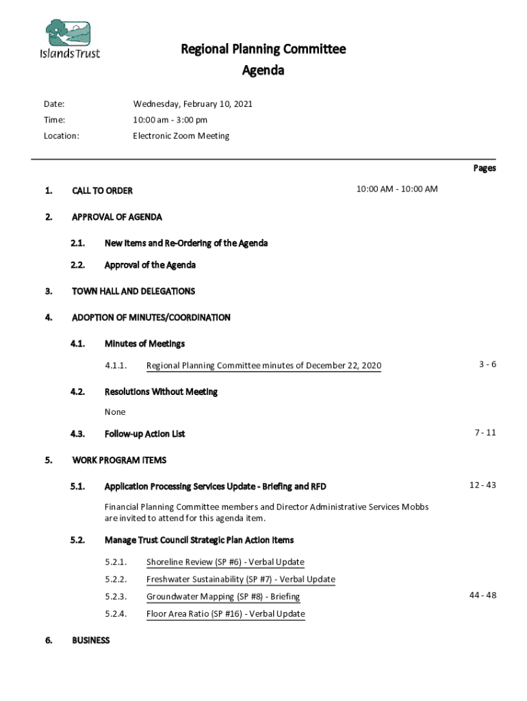 Regional Planning Committee Agenda Date:Wednesday, February 10, 2021Time:10:00 am 3:00 pmLocation:Electronic Zoom Meeting Pages 10:00 AM 10:00 AM1.CALL TO ORDER2.APPROVAL OF AGENDA 2.1.New Items and