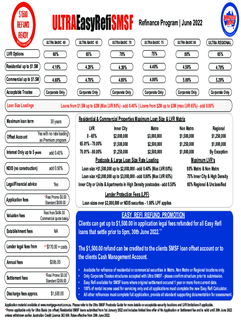 listed 20ULTRA REGIONALULTRA BASIC 60ULTRA BASIC 65ULTRA BASIC 70ULTRA BASIC 75LVR Options60%65%70%75%80%65%Residential up to $1.5M4.19%4.29%4.39%4.49%4.59%4.79%Commercial