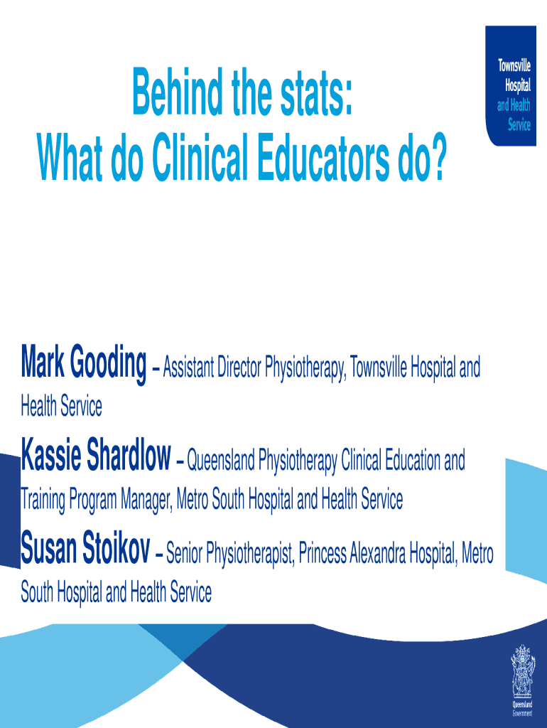 Behind the stats: What do Clinical Educators do? Mark Gooding Assistant Director Physiotherapy, Townsville Hospital and Health ServiceKassie Shardlow Queensland Physiotherapy Clinical Education and