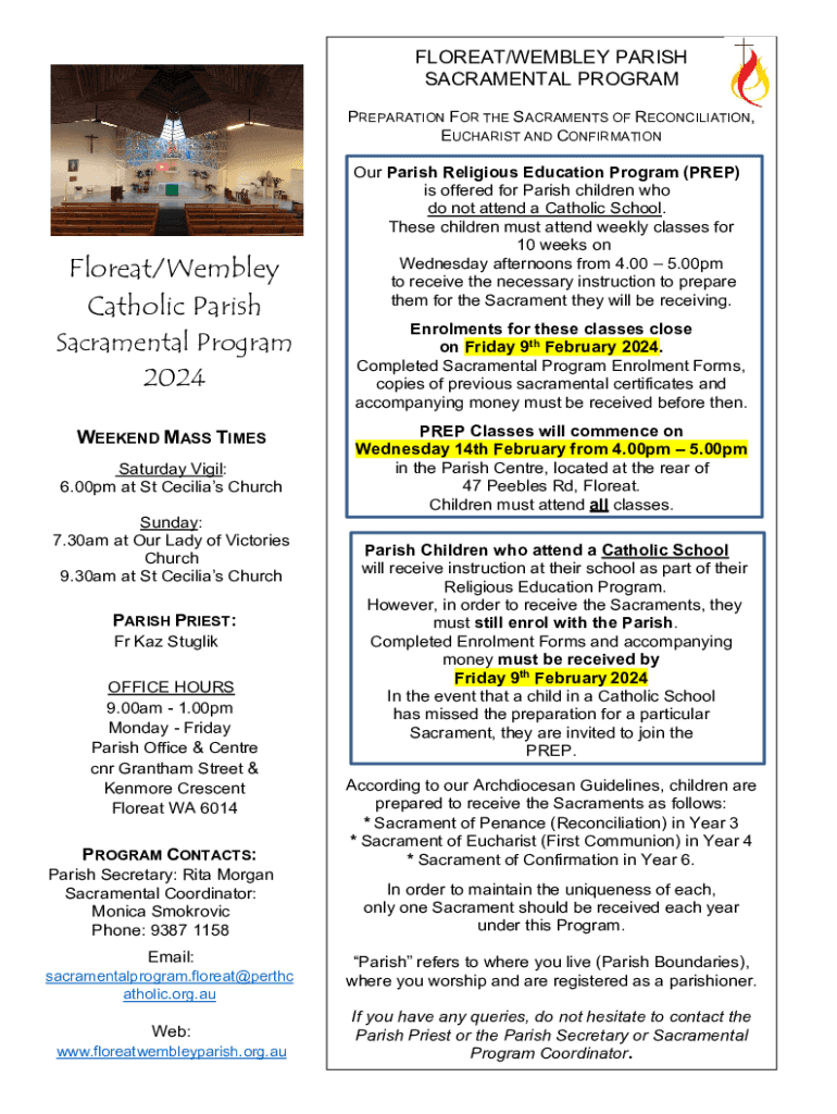 FLOREAT/WEMBLEY PARISH SACRAMENTAL PROGRAM PREPARATION FOR THE SACRAMENTS OF RECONCILIATION, EUCHARIST AND CONFIRMATIONFloreat/Wembley Catholic Parish Sacramental Program 2024 WEEKEND MASS TIMES Saturday