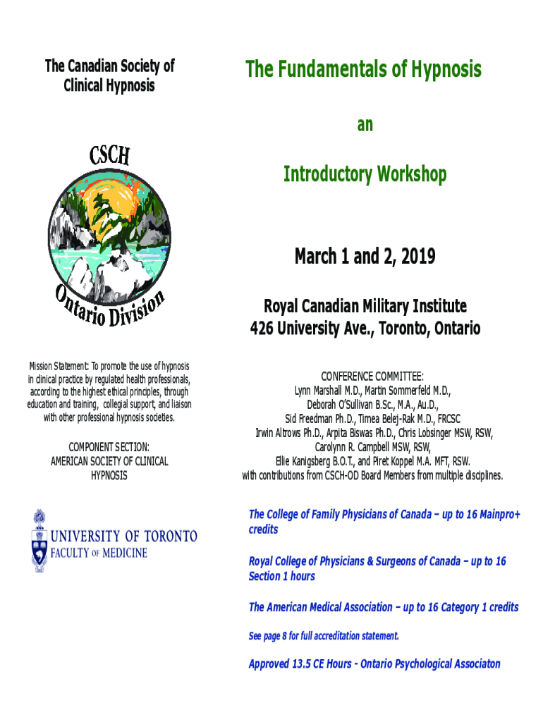 The Canadian Society of Clinical HypnosisThe Fundamentals of Hypnosis anIntroductory WorkshopMarch 1 and 2, 2019 Royal Canadian Military Institute 426 University Ave., Toronto, Ontario Mission Statement: