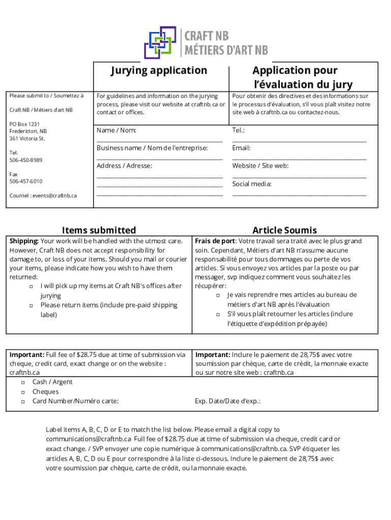 Please submit to / Soumettez Craft NB / Mtiers dart NB PO Box 1231 Fredericton, NB 361 Victoria St. Tel. 5064508989 Fax 5064576010 Courriel : events@craftnb.caJurying applicationApplication pour lvaluation