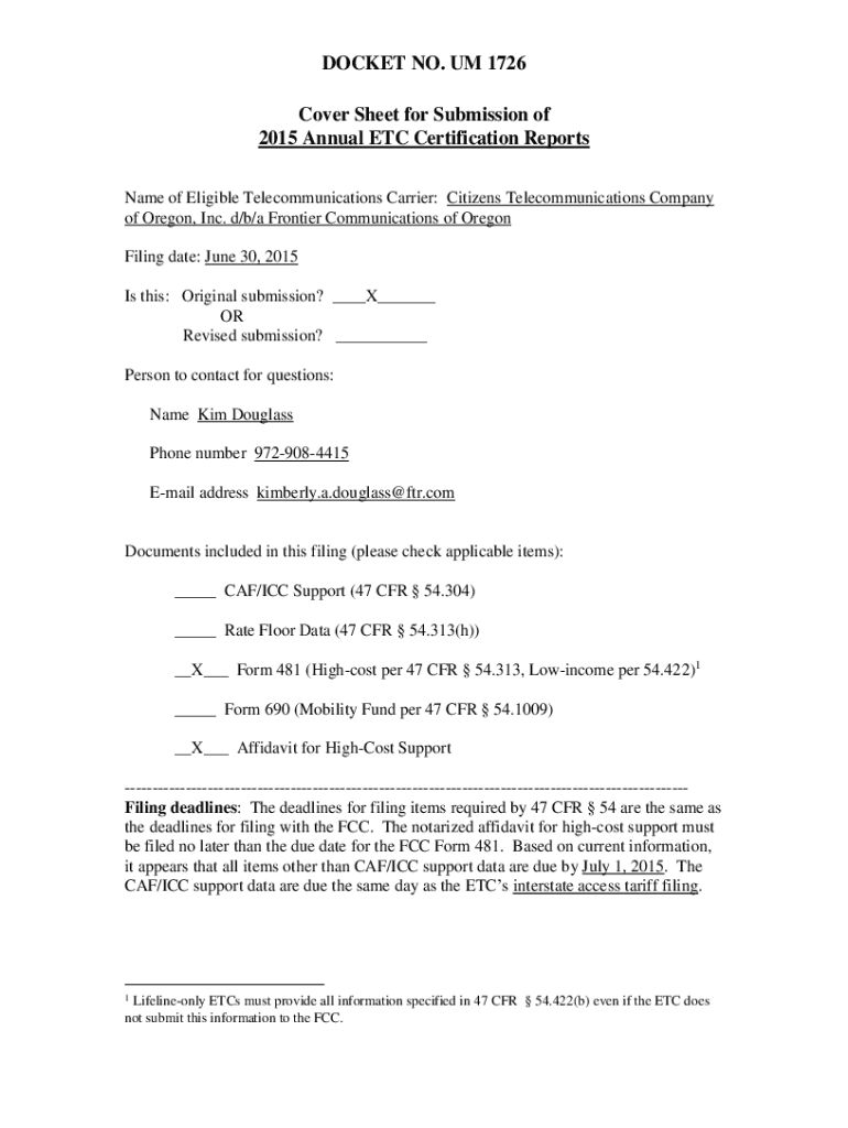 DOCKET NO. UM 1726 Cover Sheet for Submission of 2015 Annual ETC Certification Reports Name of Eligible Telecommunications Carrier: Citizens Telecommunications Company of Oregon, Inc. d/b/a Frontier