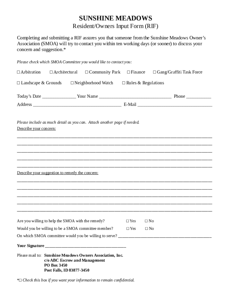 Completing and submitting a RIF assures you that someone from the Sunshine Meadows Owners