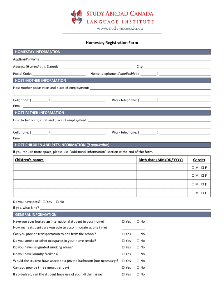 Homestay Registration Form HOMESTAY INFORMATION Applicants Name: Address (Home/Apt #, Street): Postal Code:City: Home telephone (if applicable): ()Work telephone: ()Work telephone: ()HOST MOTHER INFORMATION