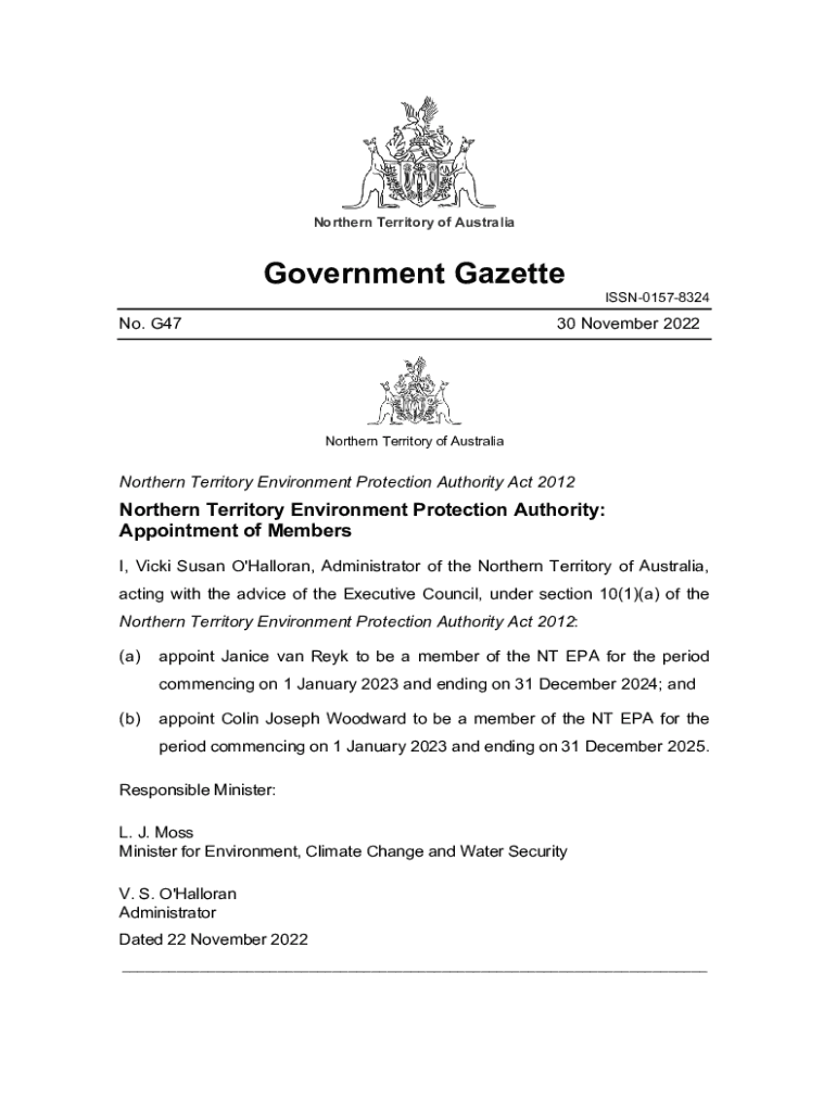 No. G47ISSN0157832430 November 2022Northern Territory of AustraliaNorthern Territory Environment Protection Authority Act 2012Northern Territory Environment