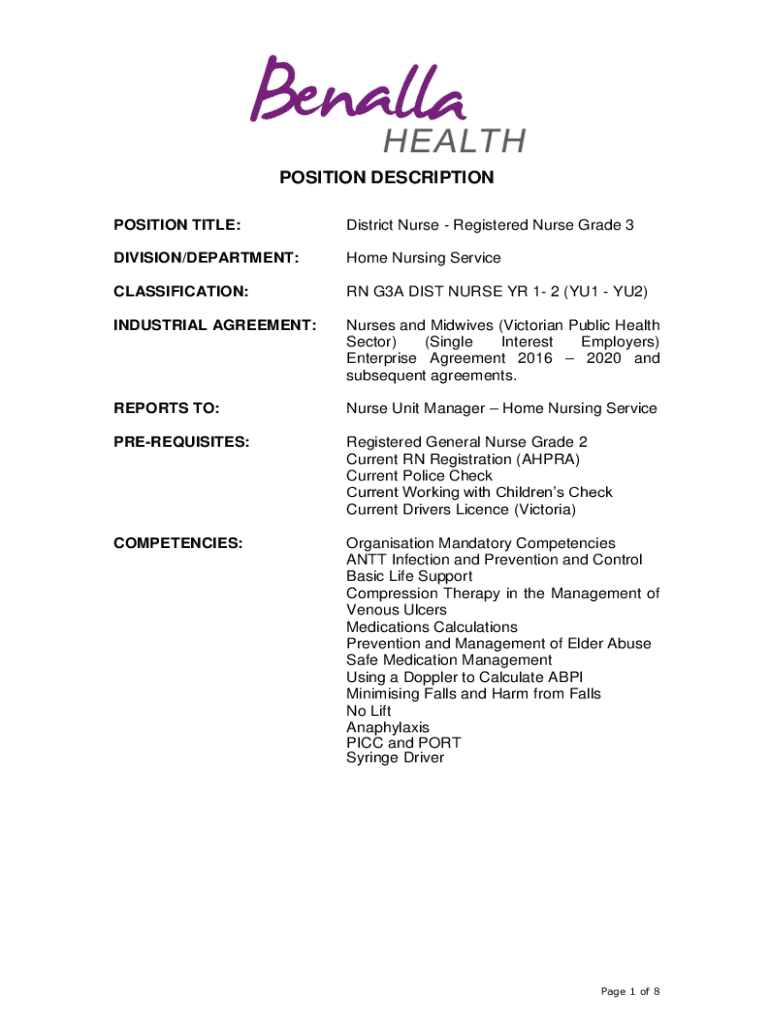 POSITION TITLE:District Nurse Registered Nurse Grade 3DIVISION/DEPARTMENT:Home Nursing ServiceCLASSIFICATION:RN G3A DIST NURSE YR 1 2 (YU1 YU2)INDUSTRIAL AGREEMENT:Nurses and