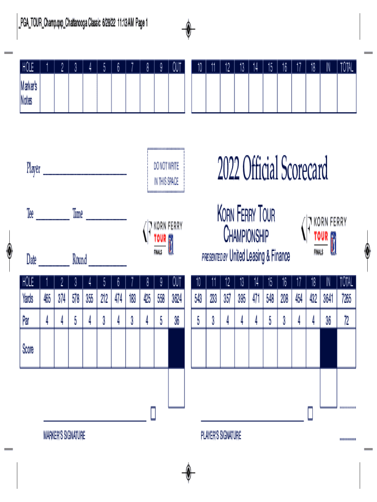 _PGA_TOUR_Champ.qxp_Chattanooga Classic 6/28/22 11:13 AM Page 1hoLe markers notes123456789ouT1011Date ___ Round ___par1415161718inToTaLKorn Ferry Tour ChampionshipTee ___ Time ___hoLe yards132022