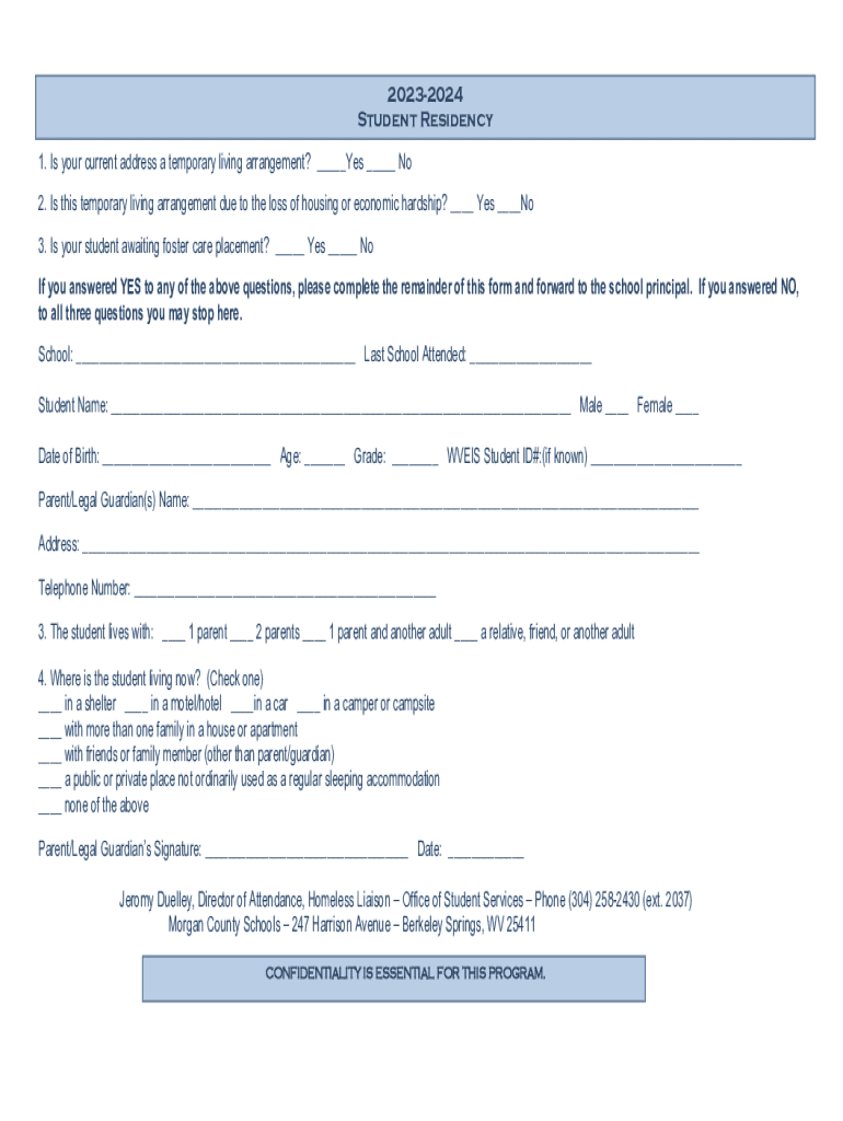 20232024 By completing this questionnaire, you help the county comply with the McKinneyVento Act, Title X, Part C of the No Child Left Behind Act. Your truthful and accurate answers help the county