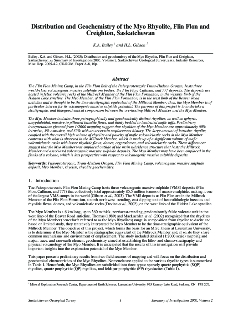 Distribution and Geochemistry of the Myo Rhyolite, Flin Flon and Creighton, Saskatchewan K.A. Bailey 1 and H.L. Gibson 1 Bailey, K.A. and Gibson, H.L. (2005): Distribution and geochemistry of the