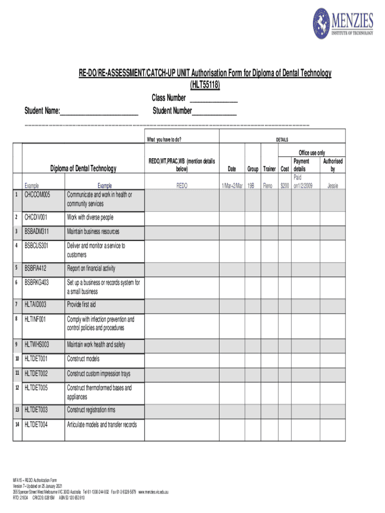 REDO/REASSESSMENT/CATCHUP UNIT Authorisation Form for Diploma of Dental Technology (HLT55118) Class Number ___ Student Name:___ Student Number___ ... What you have to do?Diploma of Dental Technology
