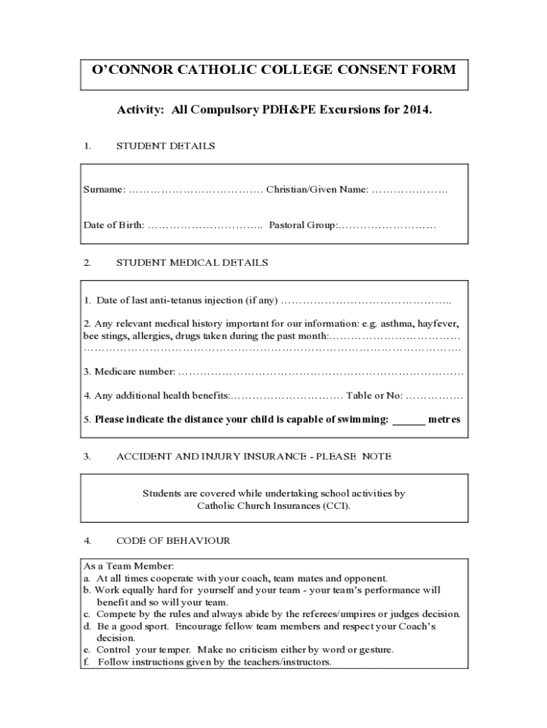 OCONNOR CATHOLIC COLLEGE CONSENT FORM Activity: All Compulsory PDH&PE Excursions for 2014. 1.STUDENT DETAILSSurname: . Christian/Given Name: Date of Birth: .. Pastoral Group: 2.STUDENT MEDICAL DETAILS1.