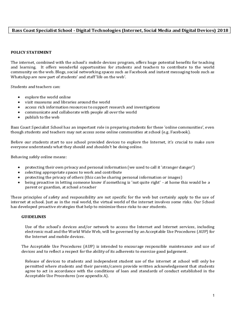 Bass Coast Specialist School Digital Technologies (Internet, Social Media and Digital Devices) 2018POLICY STATEMENT The internet, combined with the schools mobile devices program, offers huge potential
