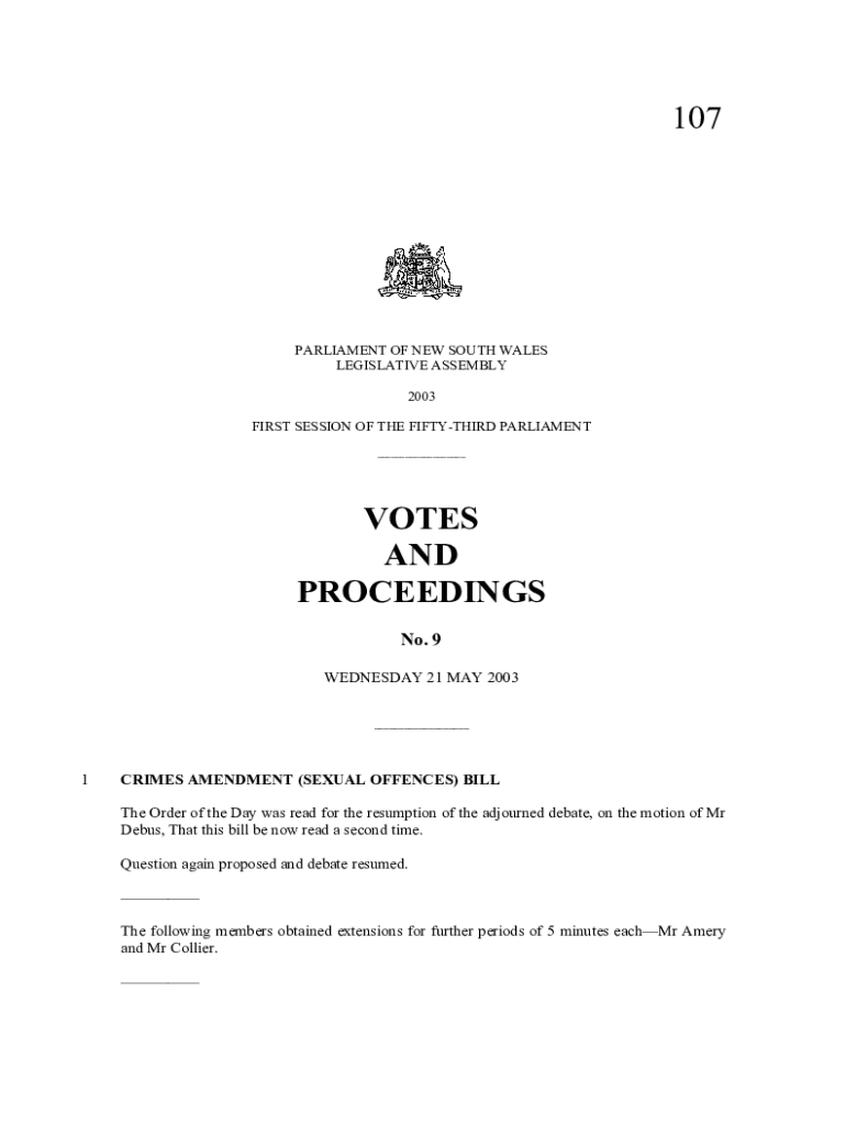 107PARLIAMENT OF NEW SOUTH WALES LEGISLATIVE ASSEMBLY 2003 FIRST SESSION OF THE FIFTYTHIRD PARLIAMENT ___VOTES AND PROCEEDINGS No. 9 WEDNESDAY 21 MAY 2003 ___1CRIMES AMENDMENT (SEXUAL OFFENCES) BILL