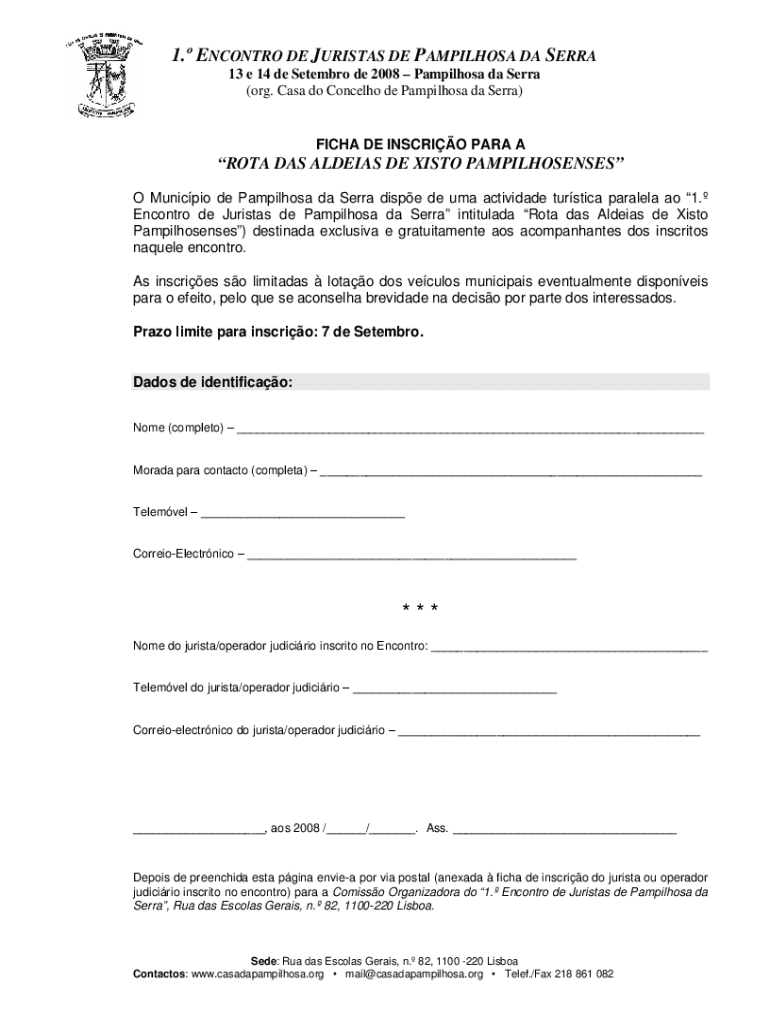 1. ENCONTRO DE JURISTAS DE PAMPILHOSA DA SERRA 13 e 14 de Setembro de 2008 Pampilhosa da Serra (org. Casa do Concelho de Pampilhosa da Serra)FICHA DE INSCRIO PARA AROTA DAS ALDEIAS DE XISTO PAMPILHOSENSES