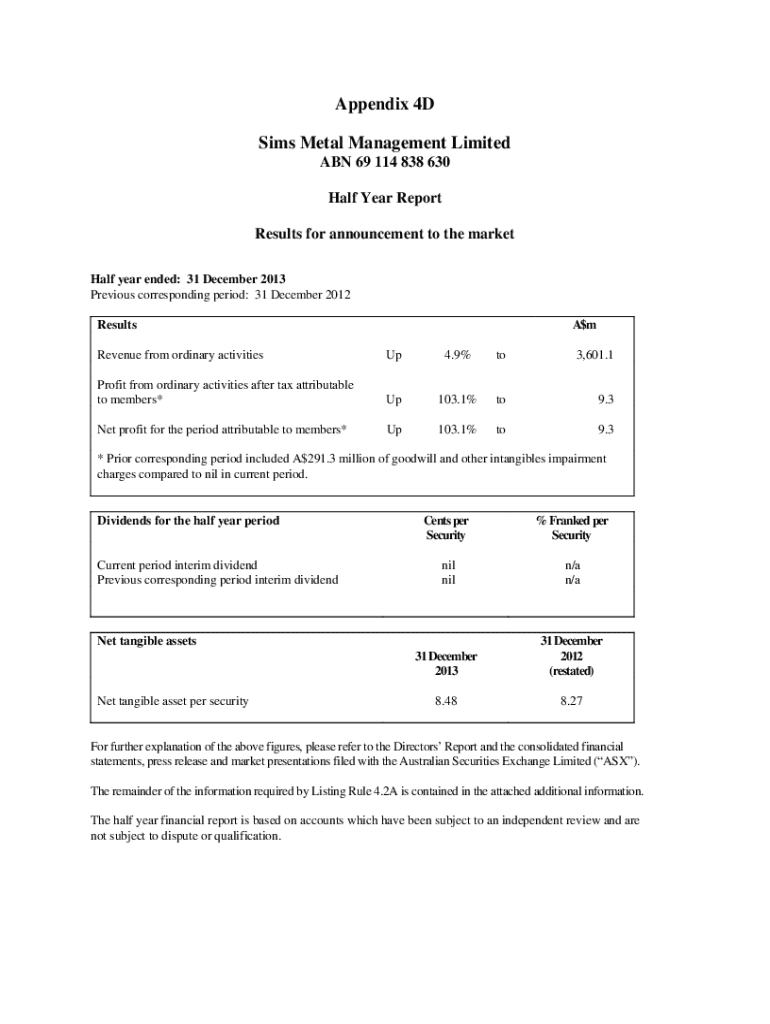 Appendix 4D Sims Metal Management Limited ABN 69 114 838 630 Half Year Report Results for announcement to the market Half year ended: 31 December 2013 Previous corresponding period: 31 December 2012