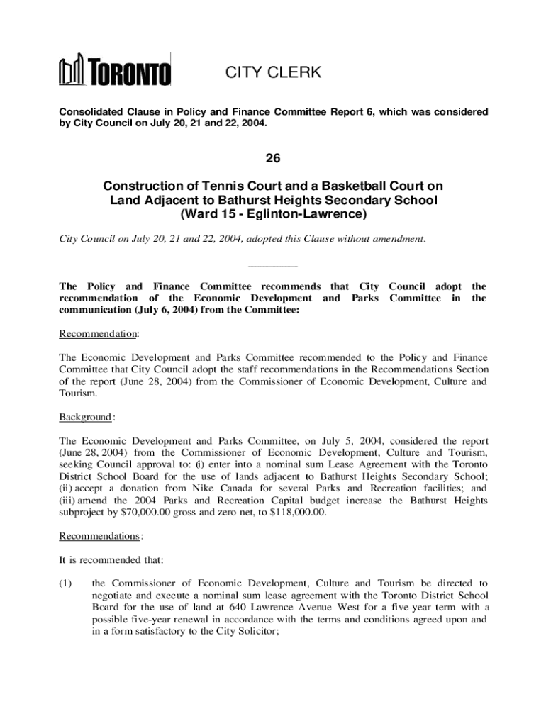 CITY CLERK Consolidated Clause in Policy and Finance Committee Report 6, which was considered by City Council on July 20, 21 and 22, 2004.26 Construction of Tennis Court and a Basketball Court on