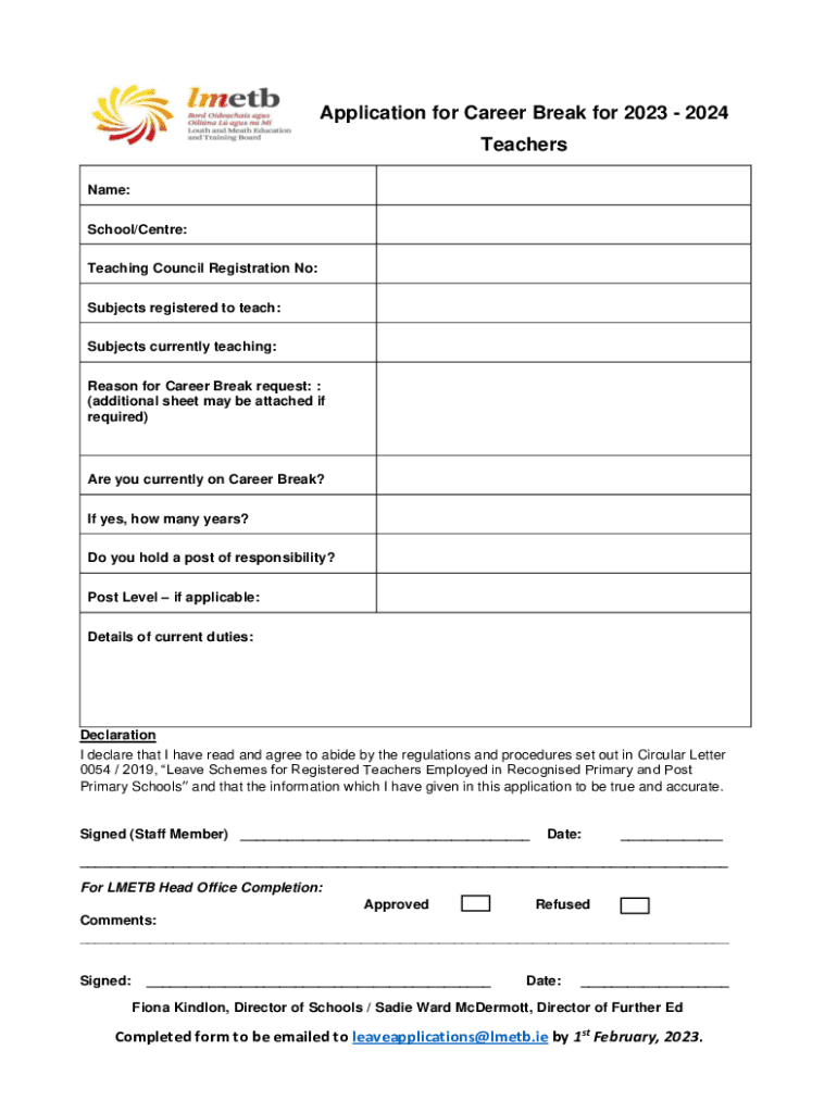 Application for Career Break for 2023 2024 Teachers Name: School/Center: Teaching Council Registration No: Subjects registered to teach: Subjects currently teaching: Reason for Career Break request: