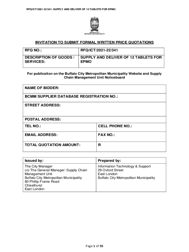 RFQ/ICT/202122/341: SUPPLY AND DELIVER OF 12 TABLETS FOR EPMOINVITATION TO SUBMIT FORMAL WRITTEN PRICE QUOTATIONS