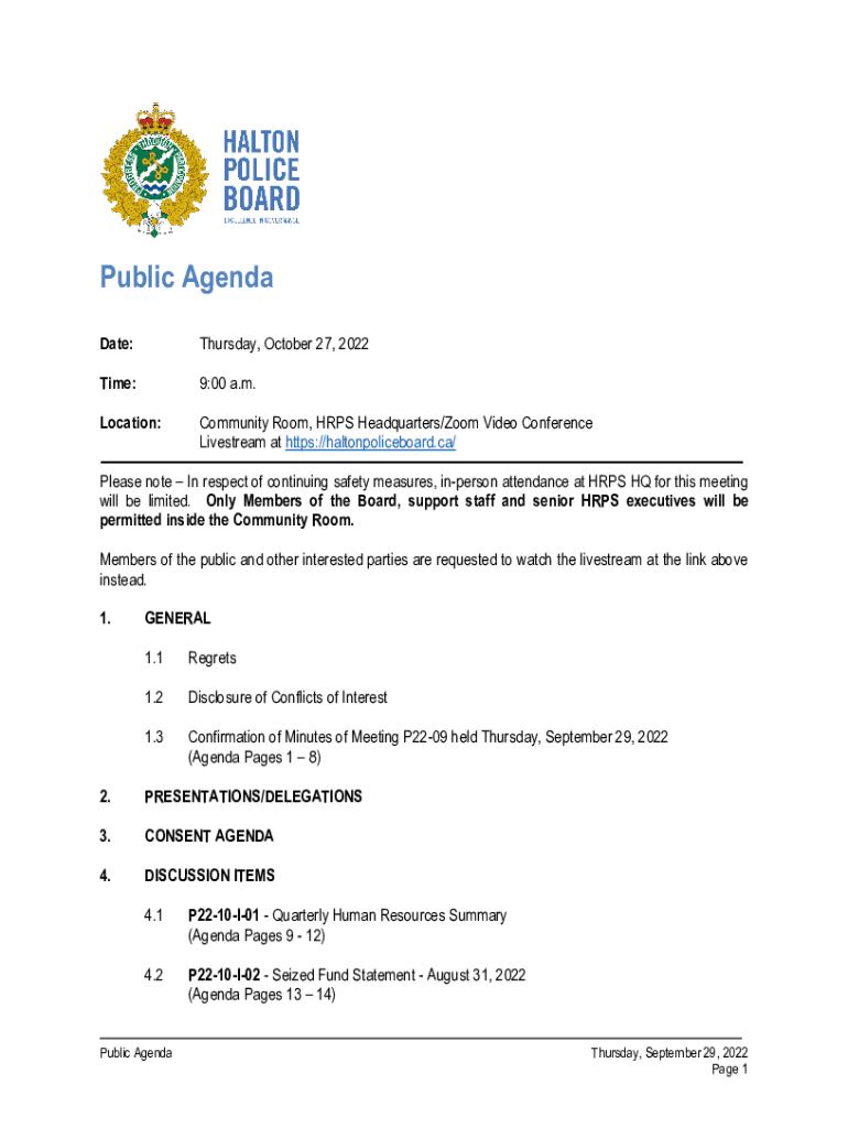 Public Agenda Date:Thursday, October 27, 2022Time:9:00 a.m.Location:Community Room, HRPS Headquarters/Zoom Video Conference Livestream at https://haltonpoliceboard.ca/Please note In respect of continuing