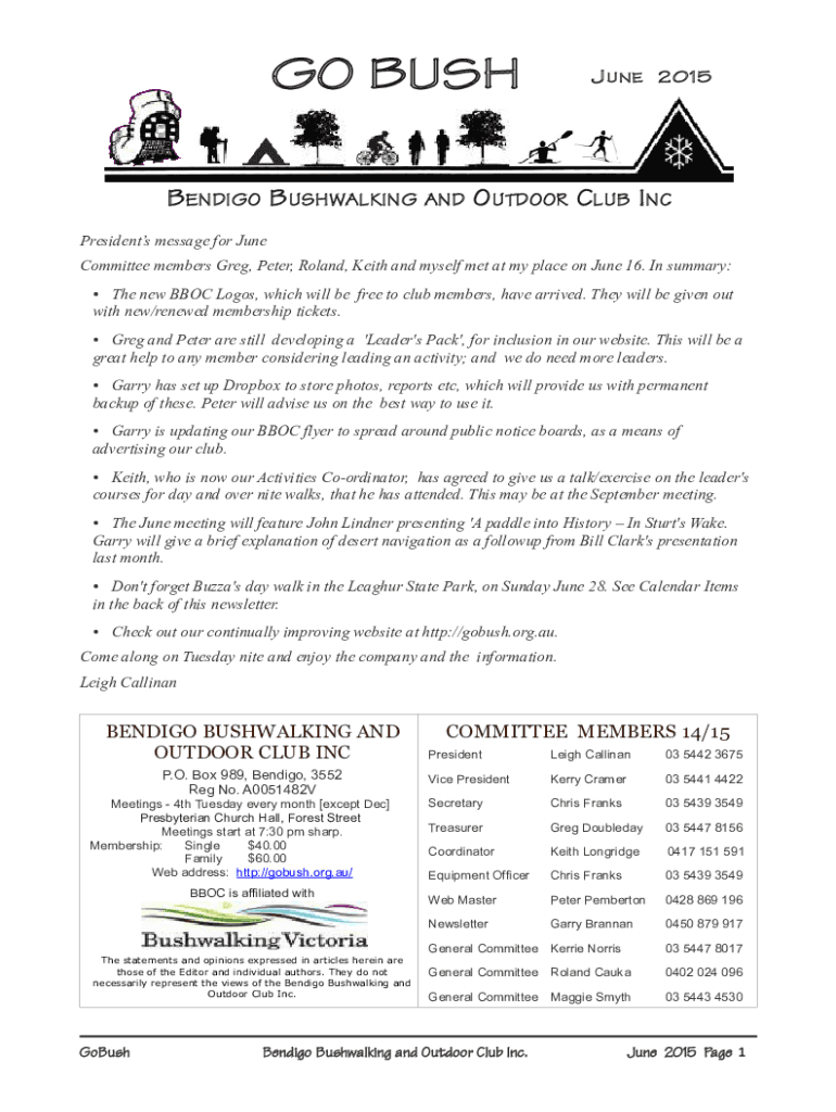 GO BUSHJ UNE 2015B ENDIGO B USHWALKING AND OUTDOOR CLUB INC Presidents message for June Committee members Greg, Peter, Roland, Keith and myself met at my place on June 16. In summary: The new BBOC