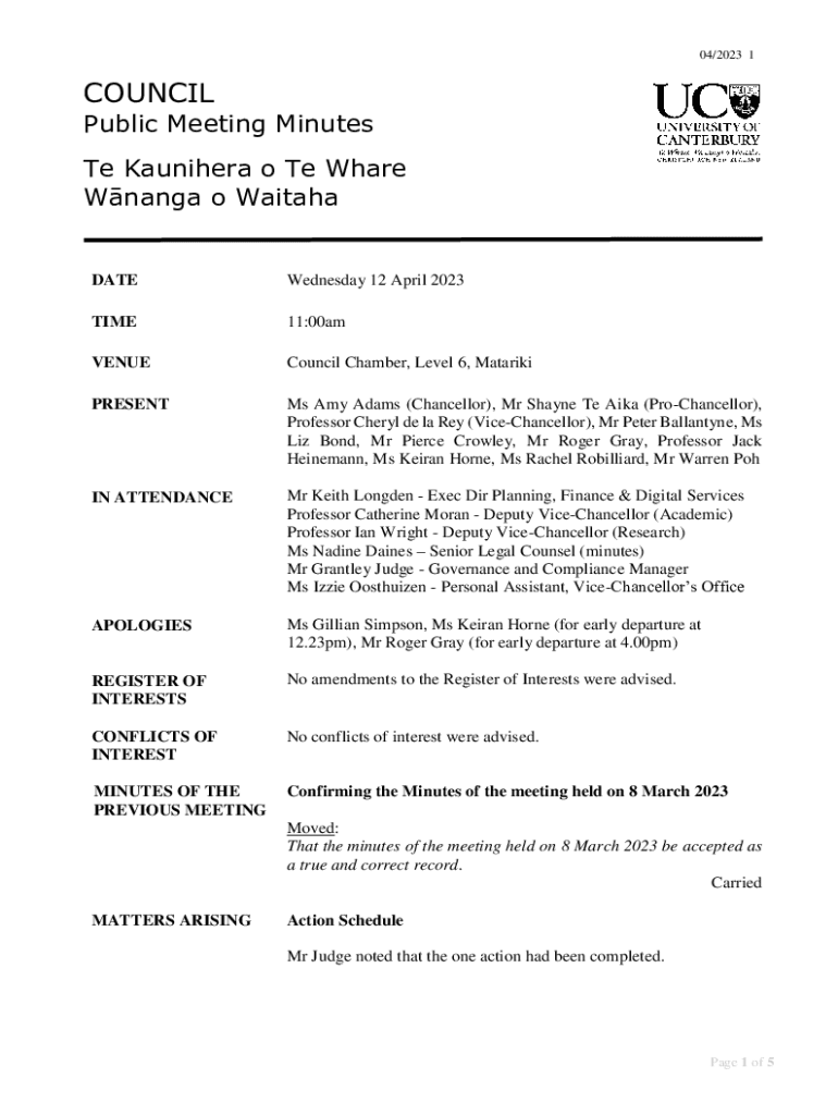 04/2023 1COUNCIL Public Meeting Minutes Te Kaunihera o Te Whare Wnanga o WaitahaDATEWednesday 12 April 2023TIME11:00amVENUECouncil Chamber, Level 6, MatarikiPRESENTMs Amy Adams (Chancellor), Mr Shayne