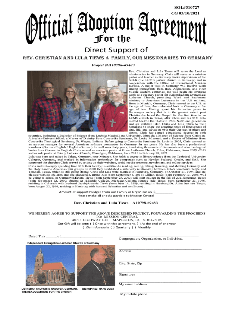 SOL#310727 CG 03/10/2021Direct Support of REV. CHRISTIAN AND LULA TIEWS & FAMILY, OUR MISSIONARIES TO GERMANY Project #A1079869483 Rev. Christian and Lula Tiews will serve the Lord as missionaries